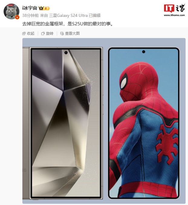 该博主还放出了 Galaxy S25 Ultra 与上代产品的对比图,新机去掉金属宽框架后,看起来更加轻巧,此外新品的四个角也采用了弧度处理而不是直角。