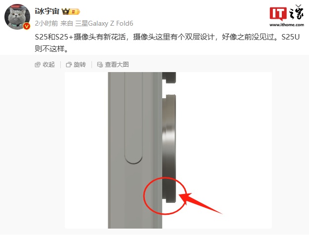 IT之家 9 月 15 日消息,博主 @i冰宇宙 今日在微博分享了三星 Galaxy S25 系列部分细节,标准版、Plus 版摄像头部分有个双层设计,S25 Ultra 则不是这样。
