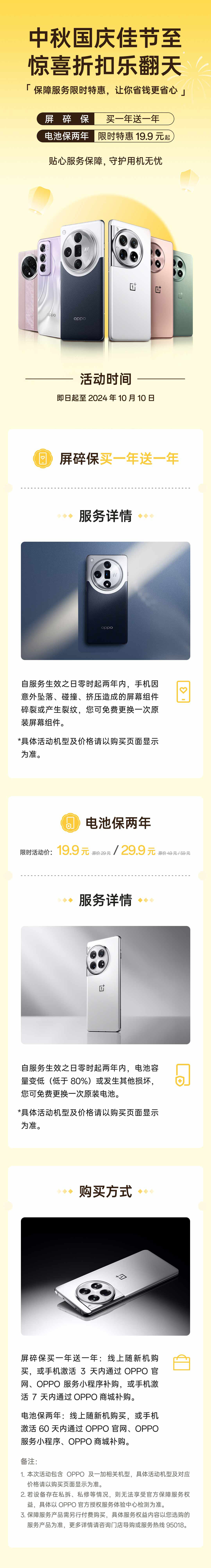 电池保两年:线上随新机购买,或手机激活 60 天内通过 OPPO 官网、OPPO 服务小程序、OPPO 商城补购。