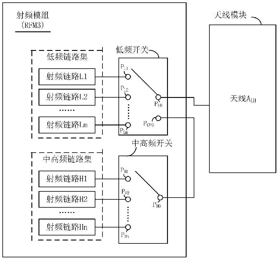 本申请实施例公开了一种射频模组,涉及射频电路技术领域,通过在射频模组中设置兼容端口,使得该射频模组能够支持不同天线方案的射频域处理。具体方案为:该射频模组包括射频链路集,以及至少两个开关组件。第一开关组件设置有输出端,该第一开关组件的第一输出端用于电连接到至少一个天线中的一个。该第一开关组件包括在该至少两个开关组件中,该第一天线包括在该至少一个天线中。该第一开关组件上还设置有兼容端口。该兼容端口用于信号在该第一开关组件的输出端与第二开关组件的输出端之间的传输,该第二开关组件包括在该至少两个开关组件中。