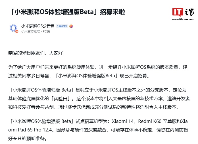 IT之家 9 月 15 日消息,小米澎湃 OS 体验增强版 Beta 已于 9 月 13 日开启招募,并在当天开启首轮答题。