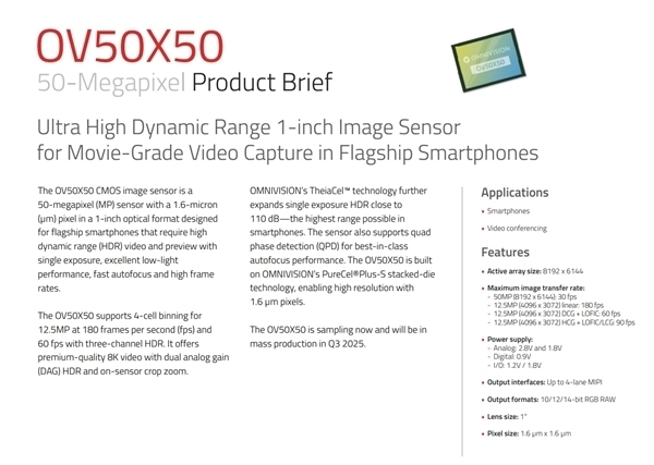 据XIAOMITIME透露,这颗镜头可能就是之前已经宣布量产的“OV50X”,在今年4月发布,拥有5000万像素,像素尺寸为1.6微米,专为旗舰智能手机设计。