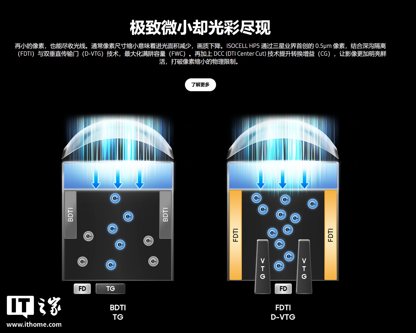 为克服小像素带来的挑战,ISOCELL HP5 集成了多项前沿技术。其中,双垂直传输门(D-VTG)和前深沟槽隔离(FDTI)技术共同作用,有效提升了每个像素的全阱容量,即容纳光信号的能力。