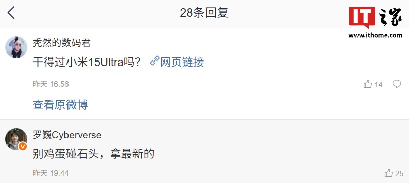 IT之家注意到,有网友询问荣耀 Magic8 Pro 的影像能否干得过小米 15 Ultra,罗巍直言:“别鸡蛋碰石头,拿最新的。”由此来看,罗巍对于荣耀 Magic8 Pro 新机在影像上的升级十分有信心。