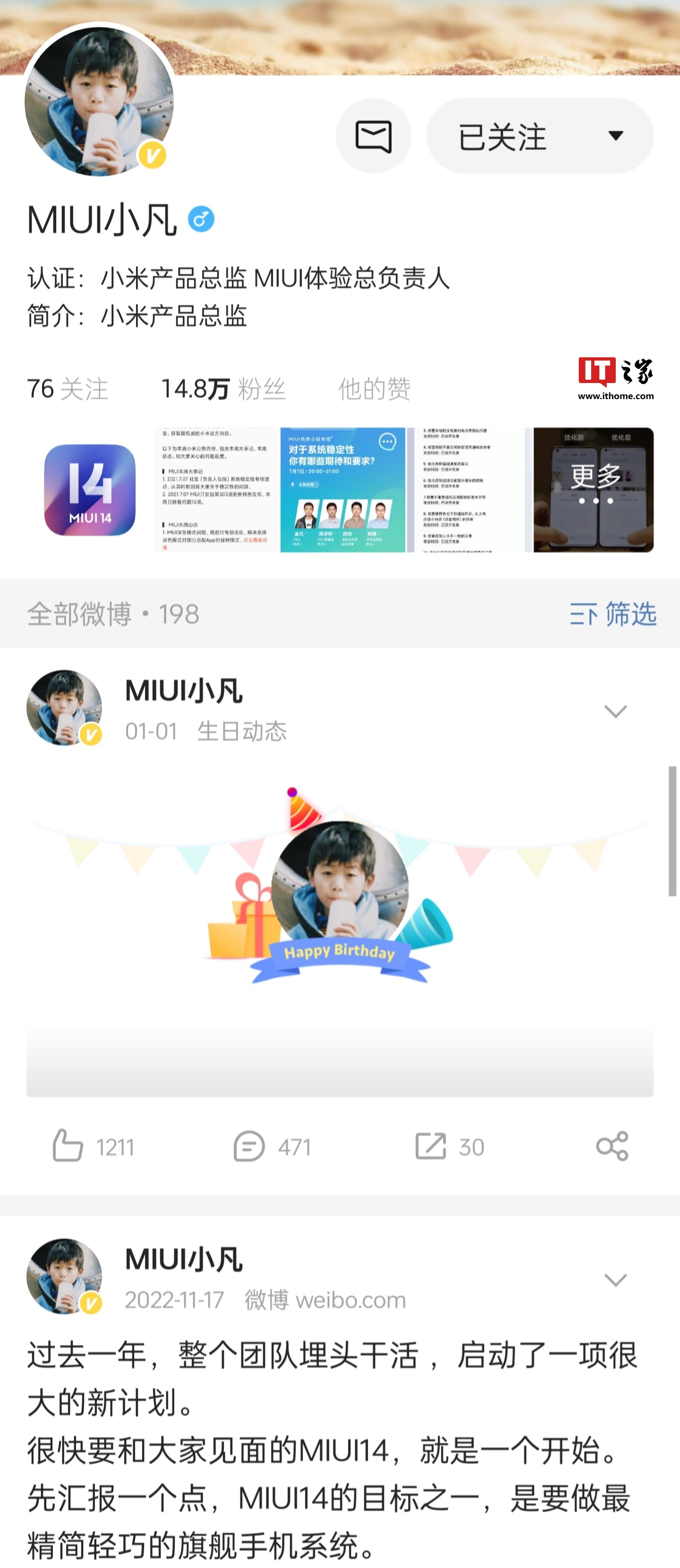 IT之家 9 月 15 日消息,小米产品总监、MIUI 体验总负责人金凡今日公开了其微博主页。