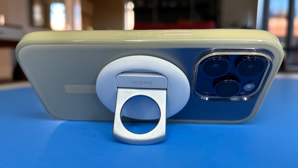 贝尔金的iPhone支架通过MagSafe实现稳固连接。David Carnoy/CNET
