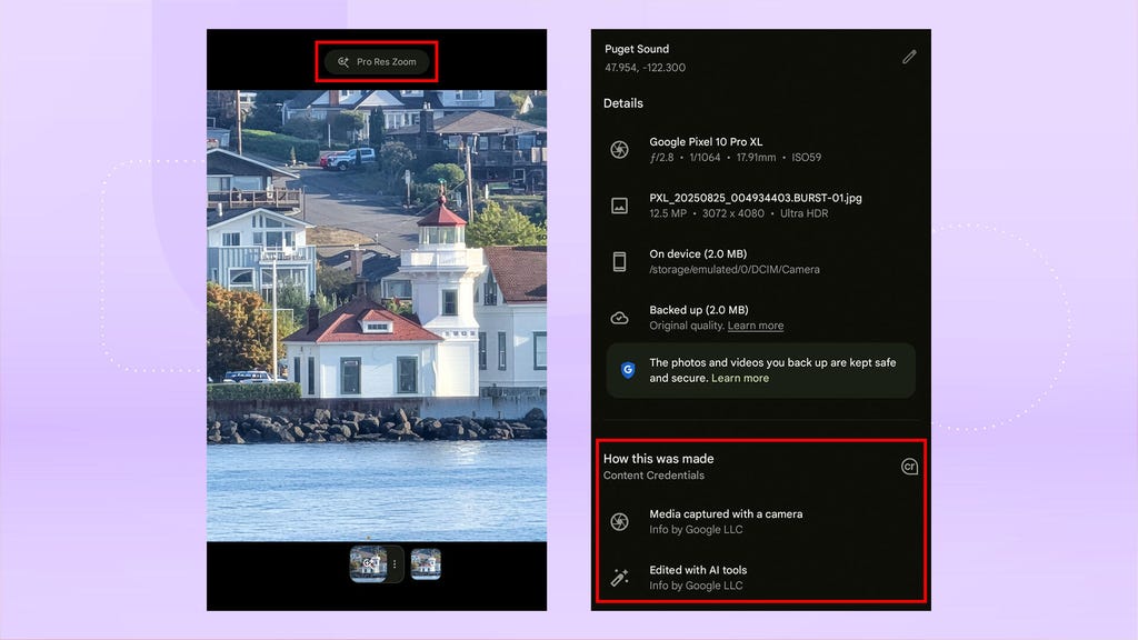 在手机上通过Google相册查看图像时,向上滑动即可显示该图像的相关信息。除了相机设置等用于拍摄该图像的数据外,底部还新增了一个“此图像的制作方式”板块。这一板块的内容并非十分详尽——一张普通照片仅会显示“通过相机拍摄的媒体”——但倘若使用了Pro Res Zoom等AI工具,则会显示“使用AI工具编辑”。(我能在Pixel 10 Pro XL和三星Galaxy S25 Ultra上看到这一信息,但在iPhone 16 Pro的Google相册应用中却无法显示。)