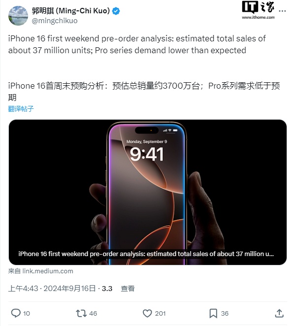 苹果分析师郭明錤刚刚发布了最新的预测报告,称最新查结果显示 iPhone 16 系列首个周末预购销量约 3700 万部,较去年 iPhone 15 系列首周末销量同比减少约 12.7%。
