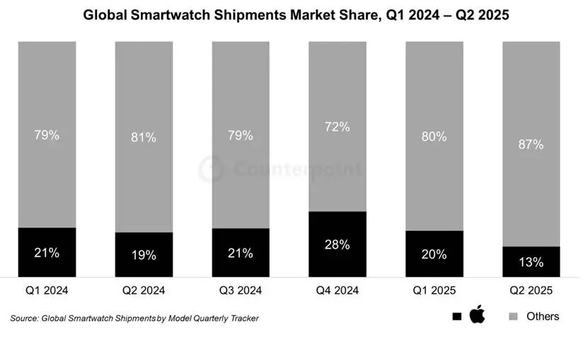 数据显示,2025年第二季度,苹果手表全球出货量为740万台,同比增长28.8%。Counterpoint数据显示,2025年第二季度全球智能手表出货量同比增长8%,其中苹果智能手表出货量占比将至13%,华为二季度出货量同比增长高达52%,全球市场份额占到了21%,首次超过苹果成为出货量全球第一,小米占比9%,位列第三。
