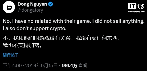 对此,Nguyen 昨日在 X 上发布了澄清内容(自 2017 年以来的第一条帖子),称他没有卖任何东西,“不,我和他们的游戏没有关系。我没有卖任何东西。我也不支持加密。”