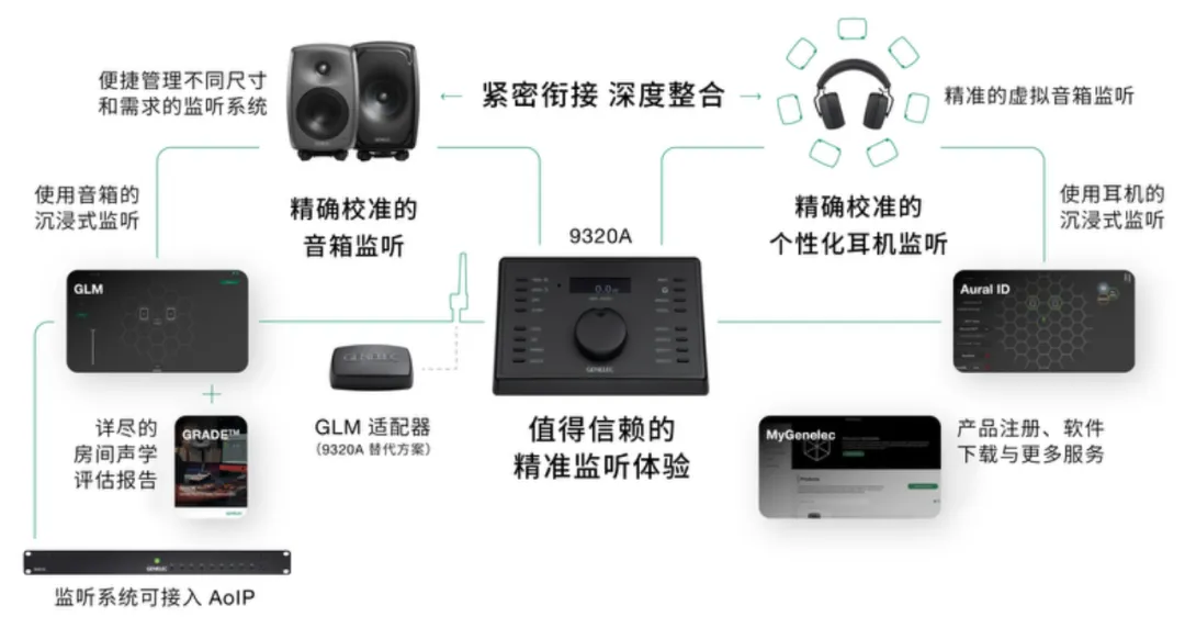 这一解决方案由 9320A 参考级控制器、参考级测量话筒,以及 8550A 专业监听耳机组成,实现音箱监听和耳机监听的衔接与整合。