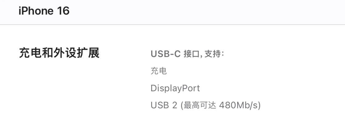 今年的 iPhone 16 和 16 Plus 仍保持 USB 2.0 速率;而发布会上被标注为支持更快速率 USB 3 的 A18 Pro 芯片,实际上 iPhone 16 Pro 和 Pro Max 的 USB-C 速率仍为 10Gb/s。
