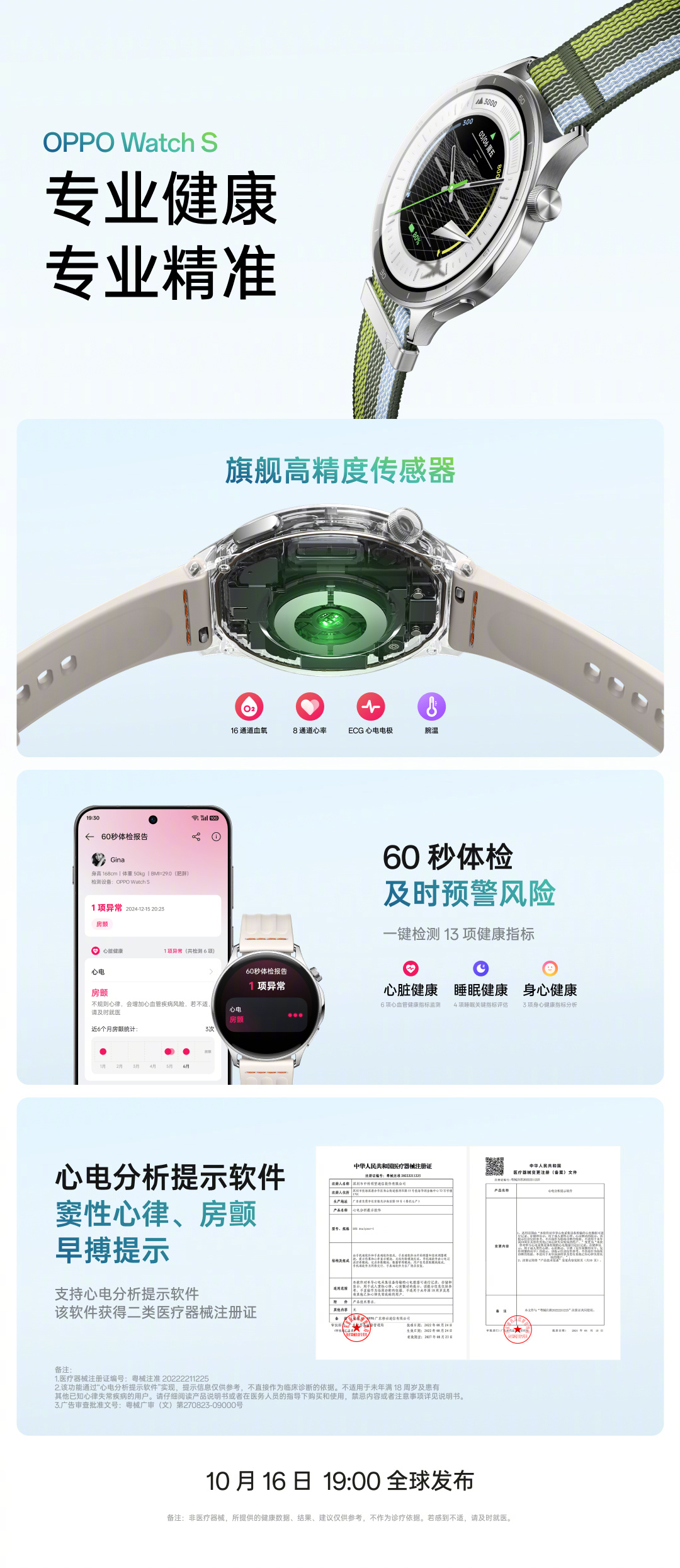 据介绍,OPPO Watch S 搭载旗舰高精度传感器,支持 16 通道血氧、8 通道心率、ECG 心电电极、腕温等,60 秒体检及时预警风险,一键检测 13 项健康指标。新品支持心电分析提示软件,该软件获得二类医疗器械注册证。
