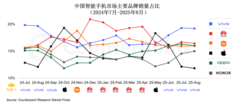 这种执拗也在不断获得用户认可。最新权威机构数据显示,vivo的国内手机市场份额在2025年第三季度再次登顶。这是vivo第四次拿下前三季度的销量第一。