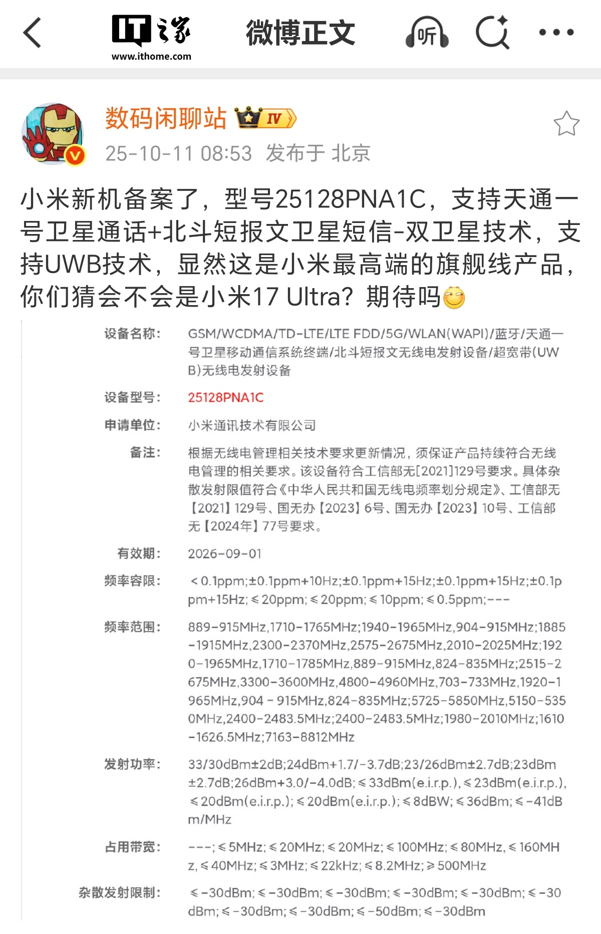 值得一提的是,上个月已经有一款小米新机通过工信部无线电核准认证,型号为 2512BPNDAC,被外界认为是小米 17 Ultra。而认证信息显示,这款新机将支持 UWB 技术,但不支持卫星通信。巧合的是,产品型号“2512”预示这两款新机都有望在 12 月发布。