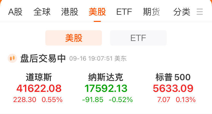 截至美股收盘,美股三大指数涨跌不一,道指创历史新高,截至当天收盘,道琼斯工业平均指数比前一交易日上涨228.30点,收于41622.08点,涨幅为0.55%;标准普尔500种股票指数上涨7.07点,收于5633.09点,涨幅为0.13%;纳斯达克综合指数下跌91.85点,收于17592.13点,跌幅为0.52%。