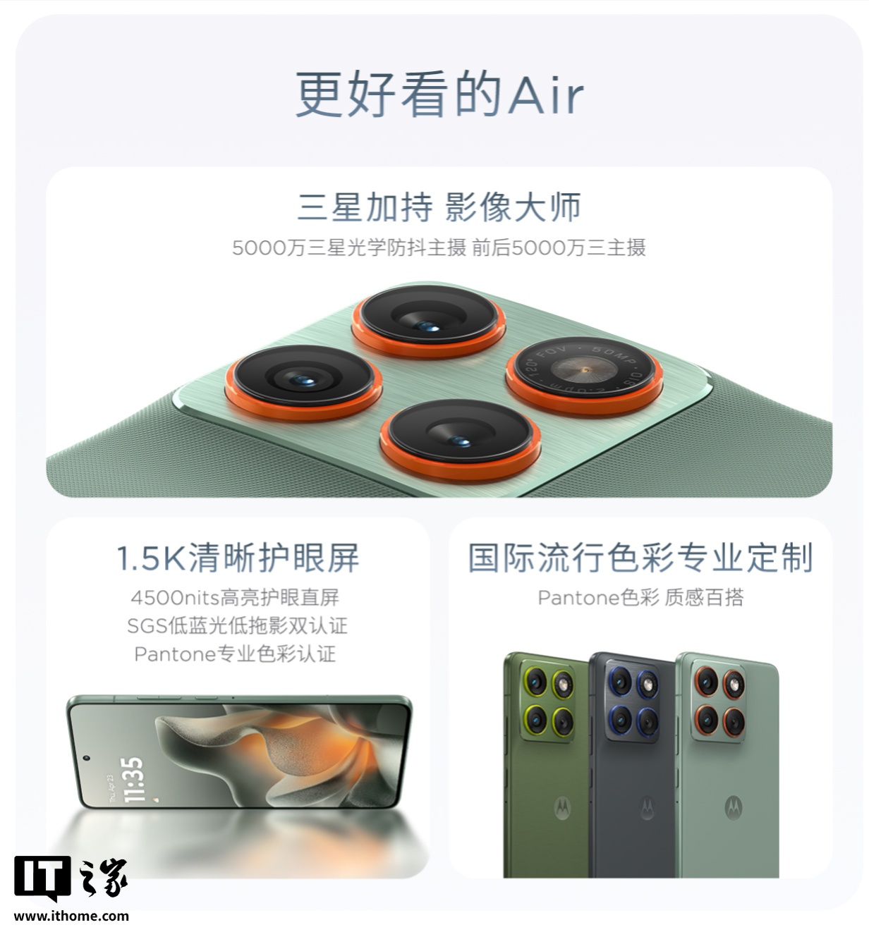 此外,这款手机还搭载 1.5K 清晰护眼屏,最高亮度可达 4500nits,通过 SGS 蓝光低拖影认证、彩通(Pantone)专业色彩认证;影像阵容拥有 5000 万像素三星光学防抖主摄 + 前后 5000 万三主摄。