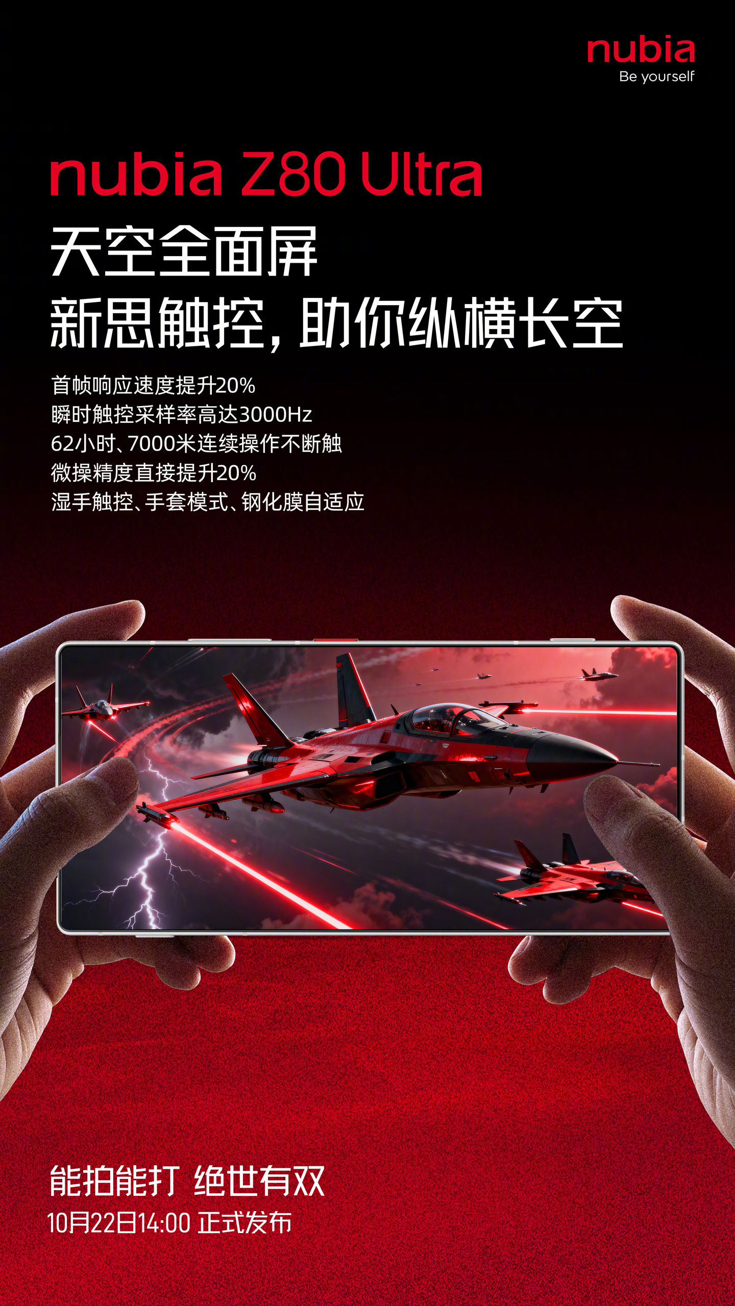 努比亚Z80Ultra将采用“天空全面屏”,支持144Hz刷新率,搭载新思科技触控方案,支持湿手触控等,将于10月22日发布,标配90W快充,搭载骁龙8至尊版处理器,提供专属摄影套装。