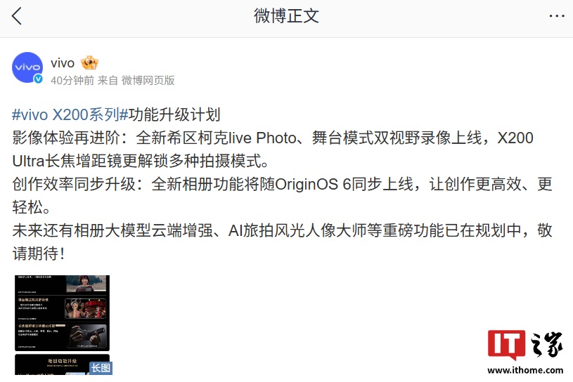 IT之家 10 月 15 日消息,vivo 官方今日公布了 X200 系列手机功能升级计划,含影像、相册等功能升级,将新增支持全新希区柯克 live Photo、舞台模式双视野录像、相册大模型云端增强等功能特性。