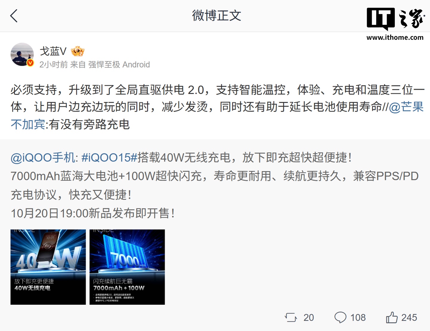 IT之家 10 月 15 日消息,iQOO 产品经理 @戈蓝V 今天在微博表示,iQOO 15 手机将升级全局直驱供电 2.0,并透露了 40W 无线充电的速度。