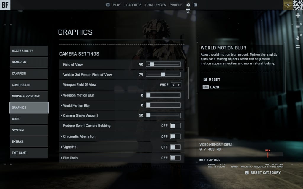 接下来,滚动到图形>相机设置。你需要将三个滑块都设置为零:武器运动模糊、世界运动模糊和相机抖动量。这样可以减轻处理器的负担,让你的系统专注于处理帧中更重要的部分,比如你的敌人。