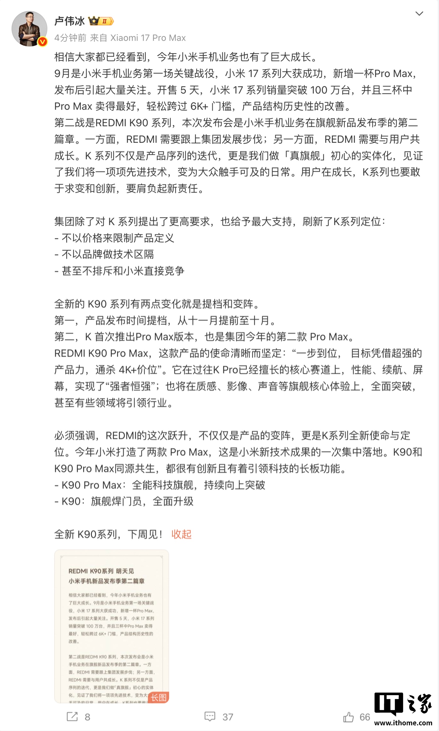 IT之家 10 月 16 日消息,今天上午,小米集团合伙人、总裁、手机部总裁、小米品牌总经理卢伟冰在微博发长文宣布:全新 REDMI K90 系列下周见,本次发布会是小米手机业务在旗舰新品发布季的第二篇章。
