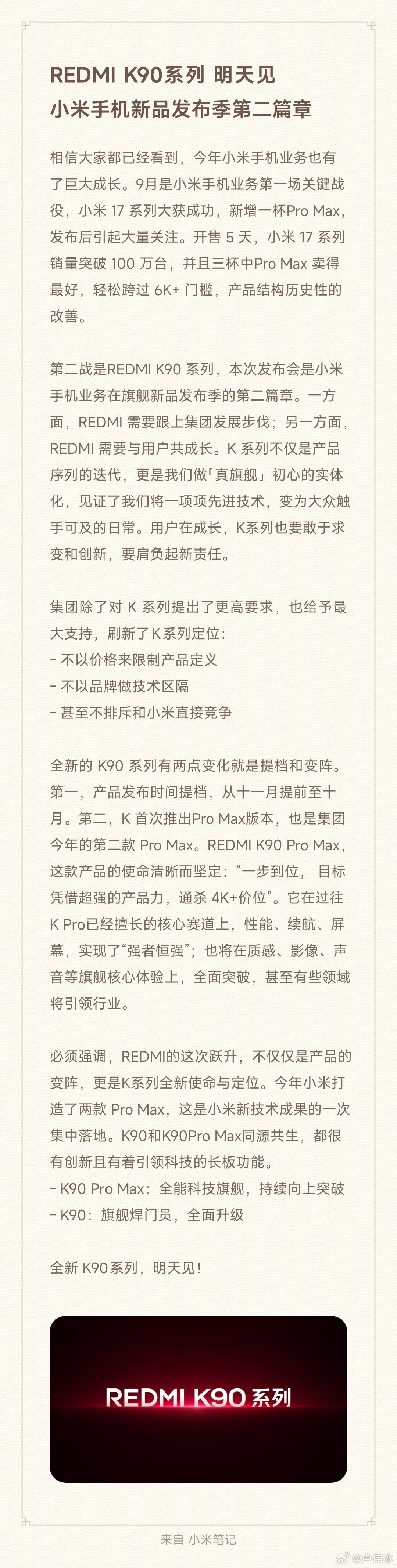 全新 K90 系列,下周见(IT之家注:卢伟冰微博配的“小米笔记”截图则显示“明天见”)!