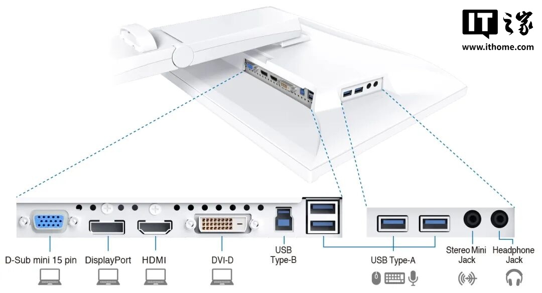 该显示器采用 531mm 宽度 ×233mm 深度的空间优化设计,可更好地融入共享办公区与小型家庭工作室;配备四大输入端口:DisplayPort、HDMI、DVI-D 及 D-Sub 接口,辅以 4 个 USB Type-A 接口与耳机插孔。