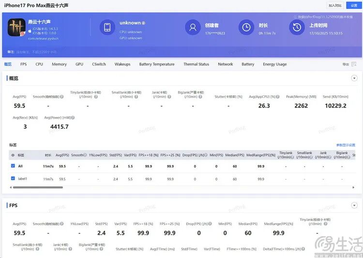 依旧还是先从轻负载的《王者荣耀》看起,到我们测试结束的10月中旬为止,目前版本的《王者荣耀》高帧率模式尚未适配iPhone 17标准版。在此基础上,59.4FPS平均帧、2853mW平均功耗的成绩,客观上确实不能算是如今特别亮眼的能效表现。