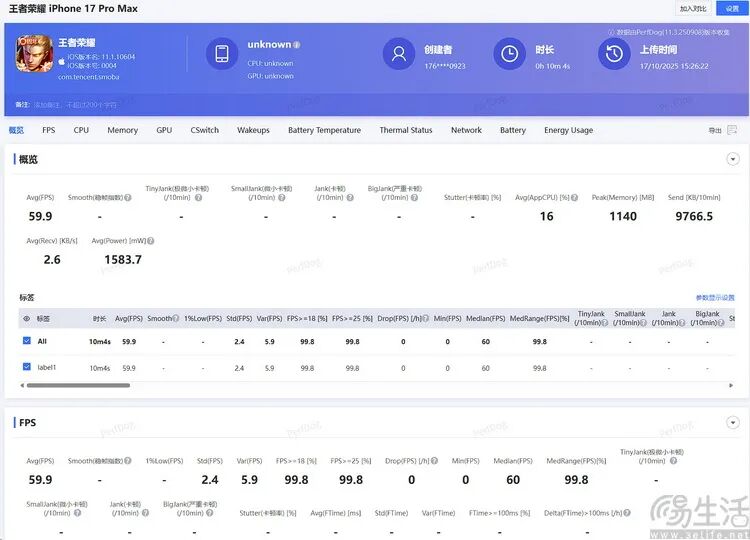不过如果是与iPhone 17 Pro Max对比,就会变得非常有趣了。首先在《王者荣耀》里,iPhone 17 Pro Max是有120FPS模式的,只不过目前版本的测试软件还无法显示(仅能显示为60FPS)。但这不重要,重要的是iPhone 17 Pro Max在游戏帧率高了一倍的情况下,平均功耗反而要比iPhone 17低了不少。