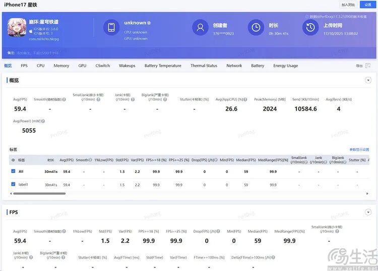 最后在《崩坏·星穹铁道》的相同场景里,iPhone 17 Pro Max的表现与《王者荣耀》里一样,都是游戏适配了120FPS、但监测软件最高只能报告到60FPS。不过可以看到,此时iPhone 17 Pro Max的负载明显更高,它的平均功耗也因此来到了接近6.6W。