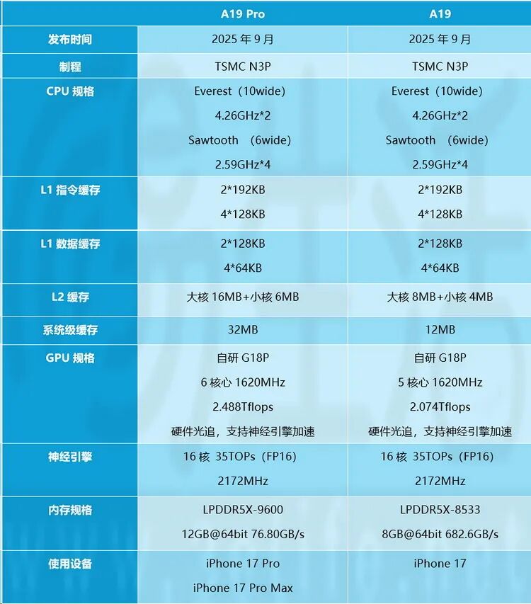首先,iPhone 17系列全系使用的都是基于N3P新制程、换用新架构的A19系列芯片。而且与其他厂商喜欢在“次旗舰”上砍主频,甚至是使用较老架构的方法不同,A19和A19 Pro的CPU、GPU,以及NPU的架构和频率都完全一样。