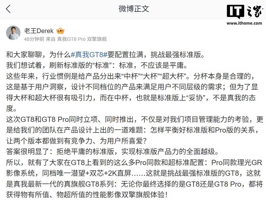 IT之家 10 月 20 日消息,realme 真我副总裁王伟(@老王 Derek)今天在微博公布了 GT8 标准版手机的详细参数。