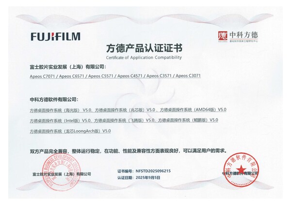 北京2025年10月21日 /美通社/ -- 近日,富士胶片商业创新Apeos系列A3数码多功能机获得中科方德产品认证证书,其中包括旗舰智能型A3彩色数码多功能机Apeos C3567/C3067/C2567、Apeos C3061/ C2561/C2061、Apeos C7071/C6571/C5571/C4571/C3571/C3071,和A3数码多功能机Apeos 5570/4570共14个机型,该系列产品已获中标麒麟、龙芯、兆芯、统信UOS兼容认证。这是继与华为合作共推鸿蒙系统普及,富士胶片商业创新(中国)全面支持IT国产化,积极推进全线产品与中国国产操作系统和中国芯产品兼容互认的又一举措。