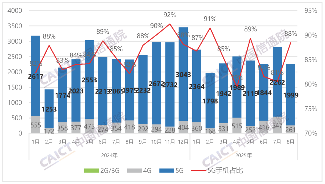 中国信通院近日发布了2025年8月国内手机市场运行分析报告,数据显示,当月国内市场手机出货量达到2260.3万部,同比下降6.0%。其中,5G手机出货量1999.2万部,同比增长1.2%,占同期手机出货量的88.4%。