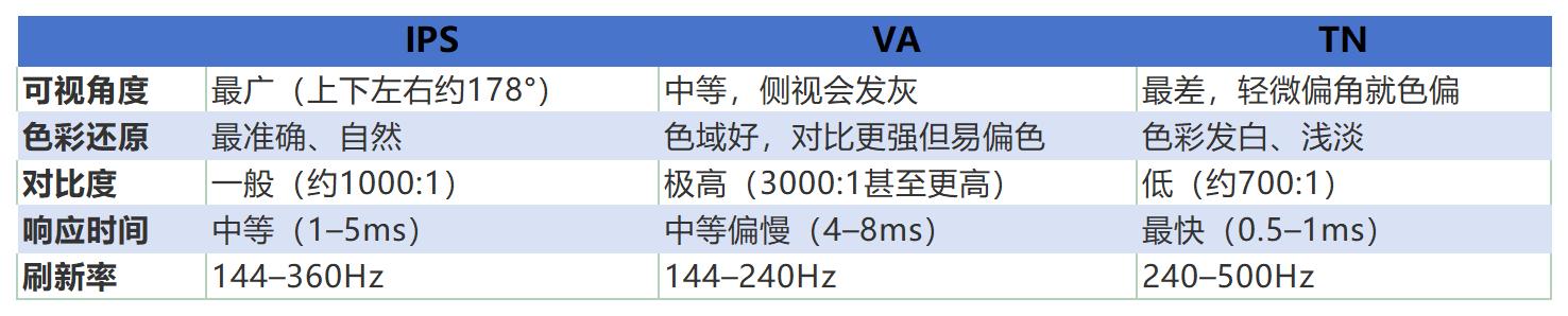在初步了解三种显示器的区别后,再来深入说说IPS、VA和TN,其中TN屏最近两年已经非常少见,常见的显示器主要以IPS和VA为主,三类面板之间的区别并不小,为了方便大家快速了解,小雷制作了一个表格: