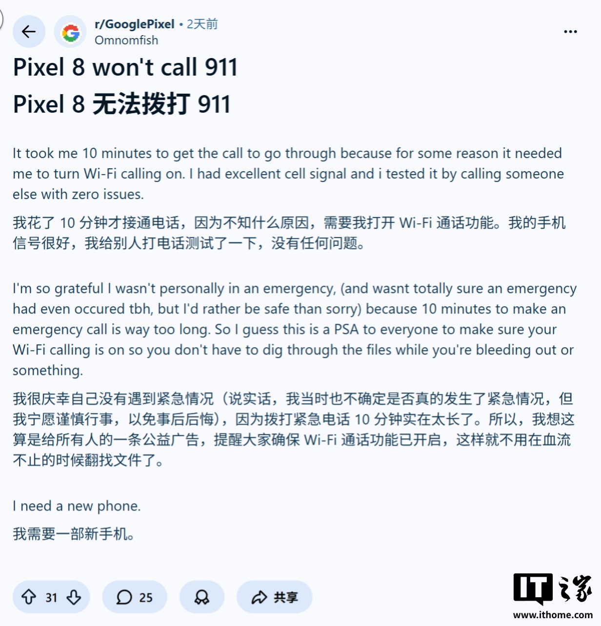 IT之家 10 月 25 日消息,科技媒体 Android Authority 昨日(10 月 24 日)发布博文,报道称多名谷歌 Pixel 手机用户在 Reddit 社区反馈,其设备在紧急情况下无法拨通 911 报警电话。