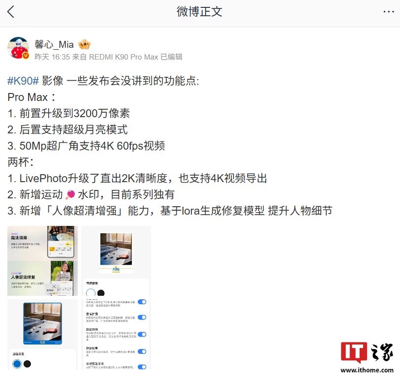 IT之家 10 月 26 日消息,小米 REDMI 产品经理胡馨心昨日在微博介绍了 REDMI K90 系列手机在发布会没讲到的影像功能,包括 K90 Pro Max 独占功能和两款机型均支持的功能。