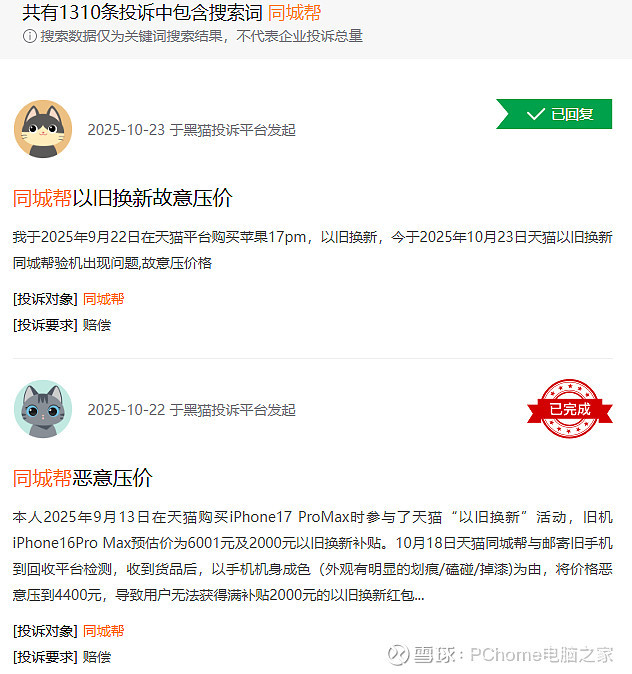 据该博主称,淘宝“以旧换新”是由一家名为“同城帮”的回收商提供服务,经查证,“同城帮”是360旗下提供手机、数码产品回收、以旧换新服务的平台,主要与天猫、苏宁等电商平台合作。然而,据黑猫投诉平台,对同城帮的投诉达1310条,投诉内容多为恶意压价。