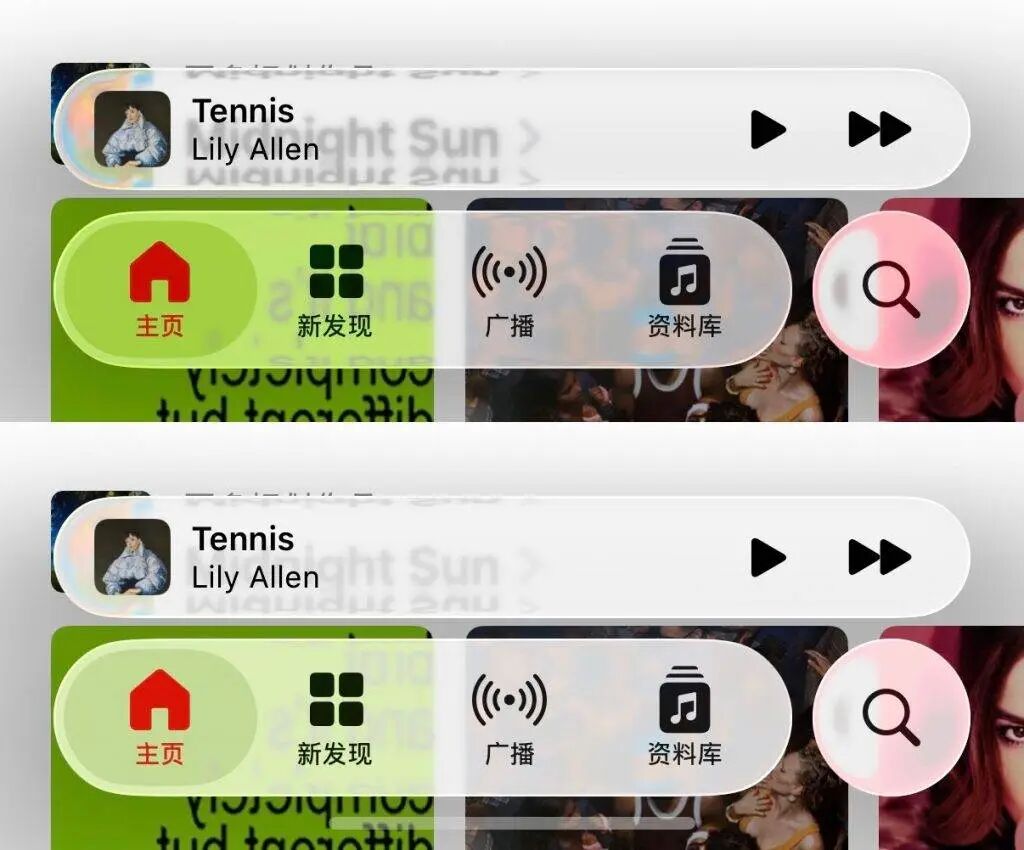 除此之外,iOS 26.1 在很多系统界面都进行了统一的微调,例如主界面 Dock 栏和照片应用,全部都加强了玻璃控件的模糊效果以加强可读性。