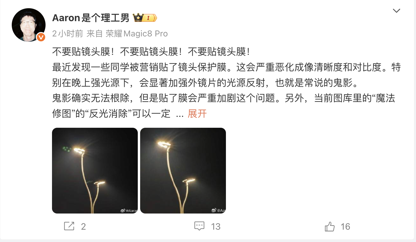 凤凰网科技讯 11月6日,荣耀影像系统专家“Aaron是个理工男”发文提醒:不要贴镜头膜。他表示,给镜头贴保护膜会严重恶化成像清晰度和对比度。特别在晚上强光源下,会显著加强外镜片的光源反射,也就是常说的鬼影。