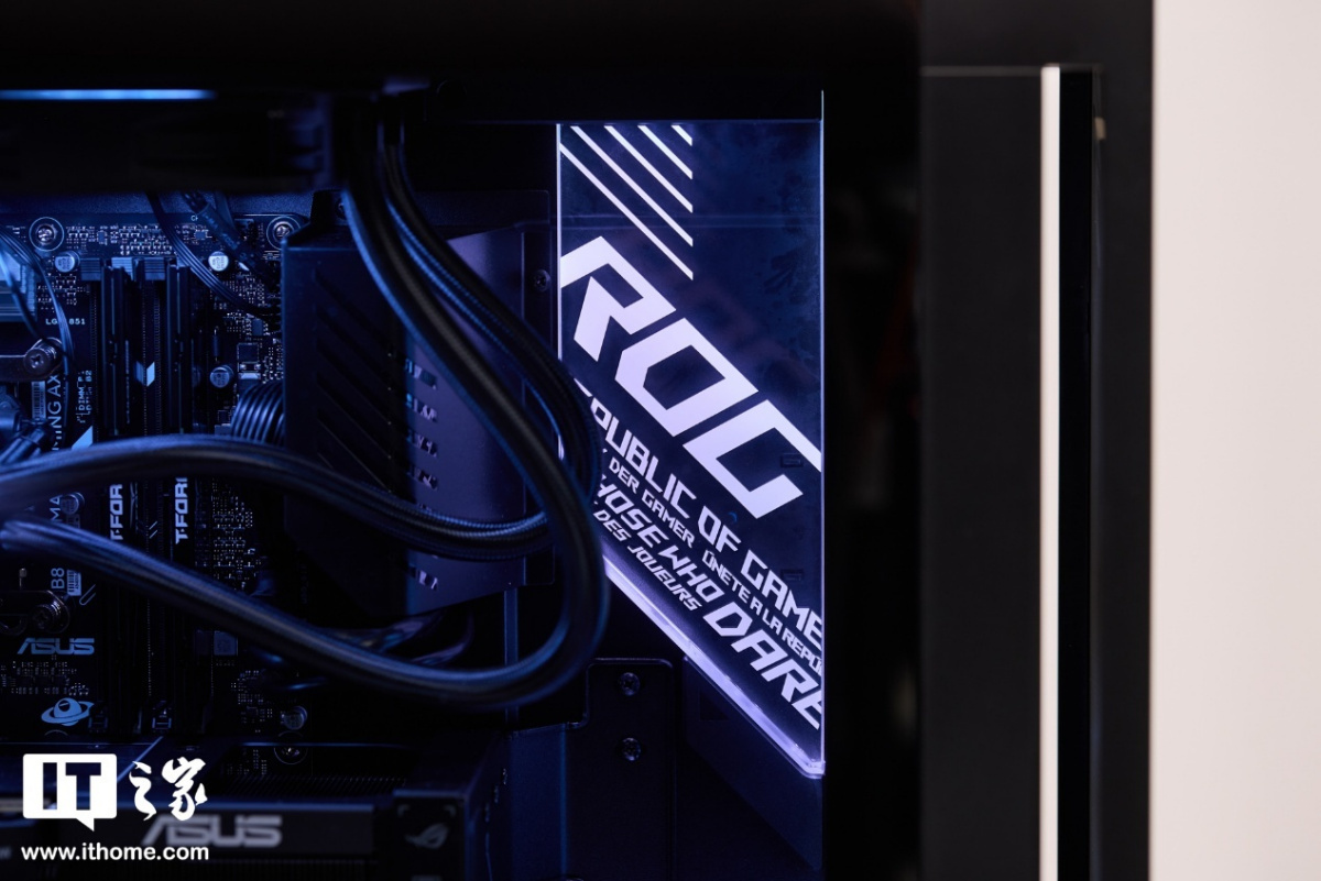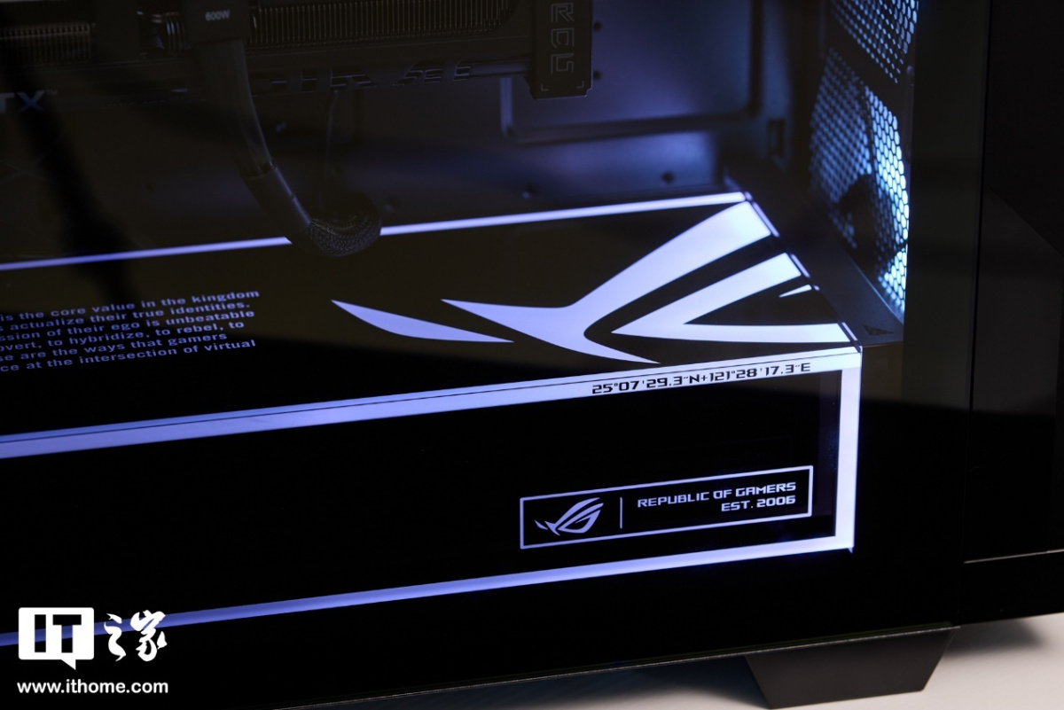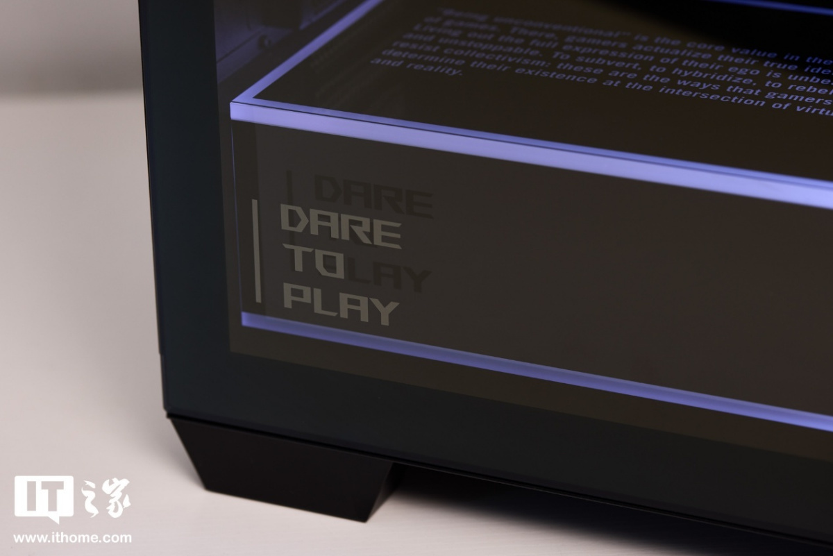 机箱内部最下方的灯箱设计也是一大特色,巧妙收纳了电源仓和硬盘仓,表面做了丰富的发光装饰元素,将 ROG 的 Logo,品牌标语和设计感全部融入其中,彰显出品牌信仰和文化属性。尤其是包裹整个边缘的包边光条,强化了灯箱的立体感,让底部空间不再有空旷感。