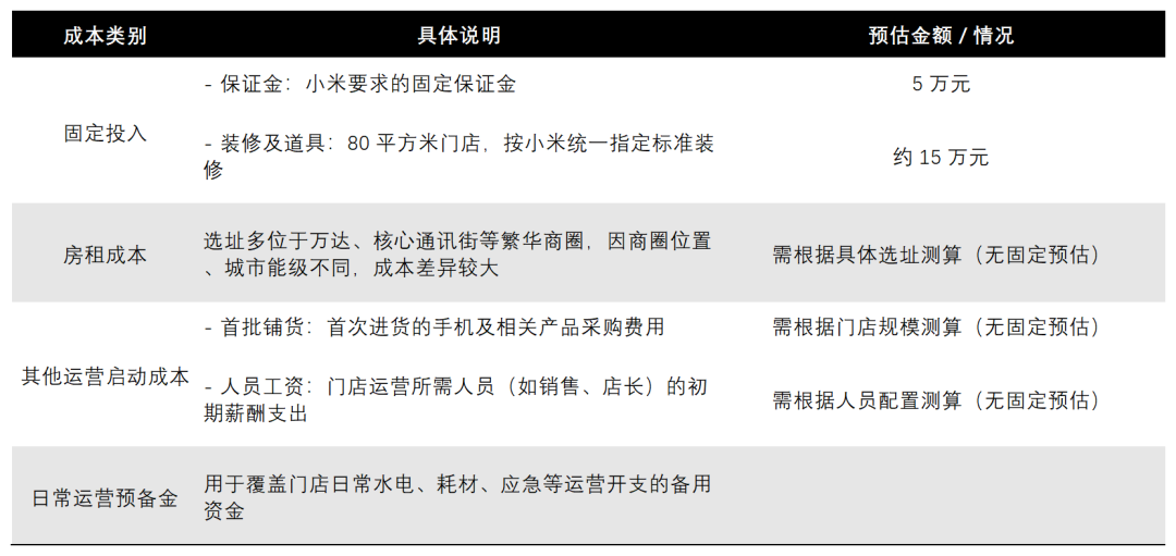 据张磊测算,在苏州这样的高线城市,开设一家小米之家专门店的前期落地成本约在100万元-120万元,中西部县域市场则为70万元-80万元。
