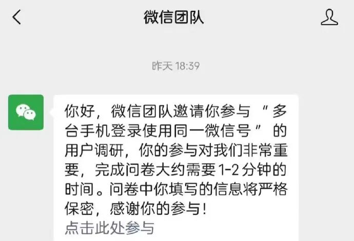 最近,很多用户都收到了一份来自微信官方的问卷调查,主题是 “关于多台手机登录使用同一微信号”。
