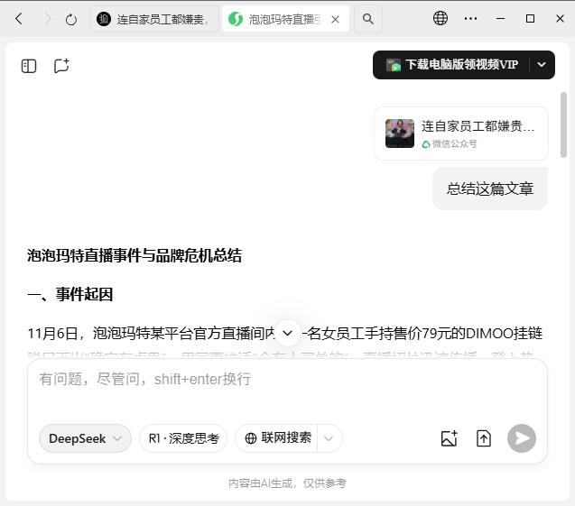 当你在 PC 端打开一篇公众号文章时,可能会在右上角发现一个新增的“总结”按钮,旁边还标注着“由元宝提供”。