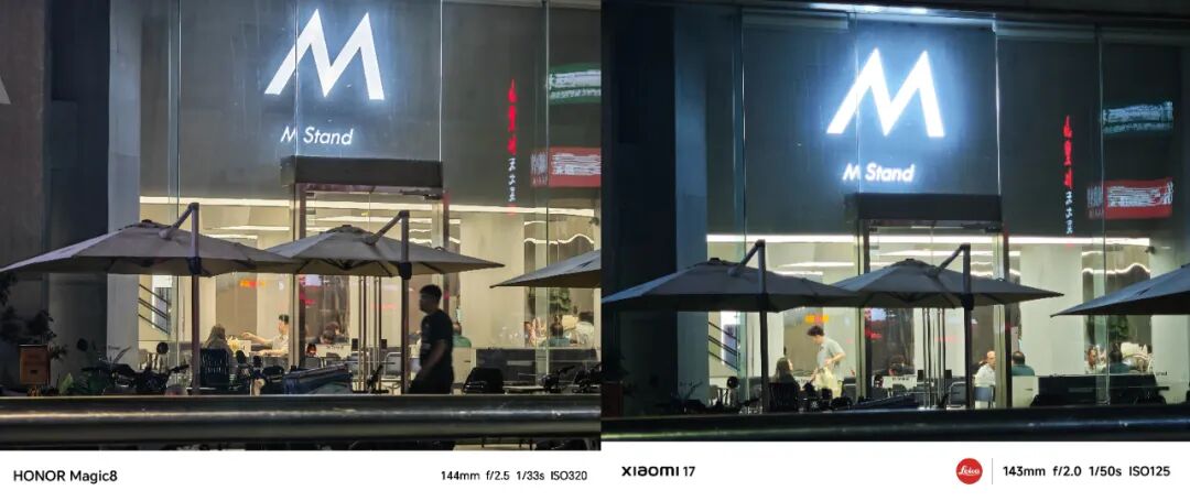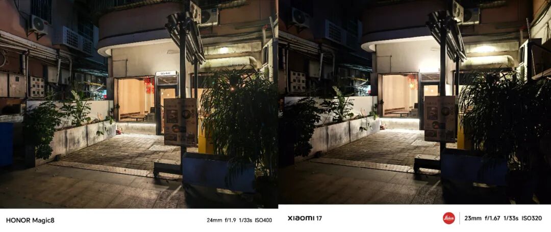 不过到了晚上,小米 17 面对高光会有点乏力,很容易出现高光溢出的情况,暗处的细节也容易丢失,而荣耀 Magic 8 则会处理得更舒适。
