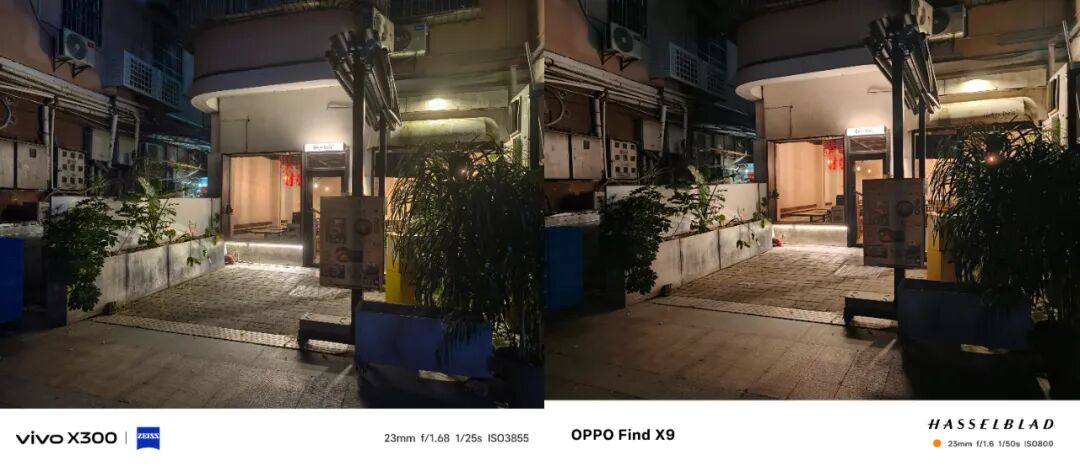 没有 2 亿像素的日常场景,vivo X300 的主摄表现也相对优秀,但夜景容易出现泛白的情况。OPPO Find X9 的优势场景恰好就是光线比较复杂的夜景,是四台手机中观感最舒适的,平衡了明暗对比和细节呈现。