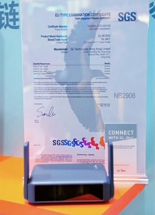 上海2025年11月10日 /美通社/ -- 2025年11月8日,在第八届中国国际进口博览会上,国际公认的测试、检验和认证机构SGS正式为深圳市广联智通科技有限公司(以下简称"广联智通")的Wi-Fi 7便携路由器BE3600颁发FCC ID证书和CE RED证书。SGS电子电气服务部科技电子产品线总监许国科与广联智通产品线负责人张迪平等领导出席了此次颁证仪式。