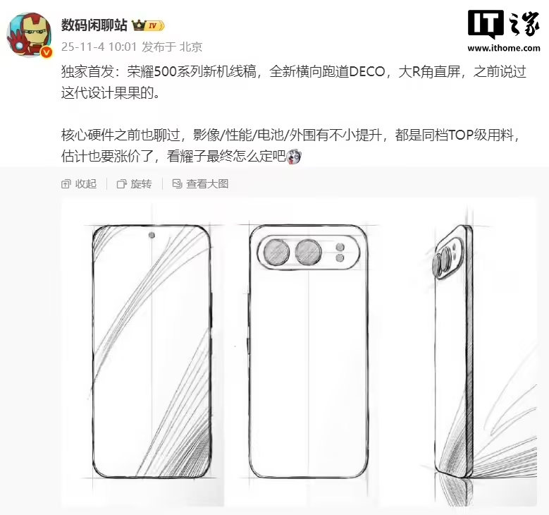 在外观设计上,荣耀 500 系列似乎也将迎来全新变革。曝光线稿显示,新机将采用全新横向跑道 DECO 与大 R 角直屏,其设计语言更趋简洁、硬朗,这与荣耀对工艺进阶的持续追求相符。另有消息称,荣耀 500 系列新机在影像、性能、电池以及其他外围配置都将采用同档位顶配用料。