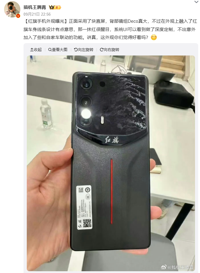 9 月 21 日,有多位博主在社交平台分享了红旗手机图片。这款新机采用了与魅族 21 系列完全不同的设计语言,配备超大镜头 Deco,并且融入了红色线条设计,“红旗”logo 也出现在了机身背面。此外,新机的系统 UI 预计进行了深度定制,提供“红旗智联”等应用。